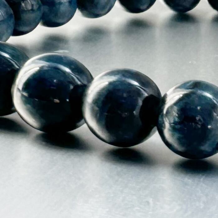 天然石ブレスレット【デュモルチェライト】は、ブラジル産の高品質なデュモルチェライトを使用した、深い濃紺が魅力のアイテムです。7.5mmの小玉は手首にフィットしやすく、内径は約16.5cmのフリーサイズですので、品良く着けられます。